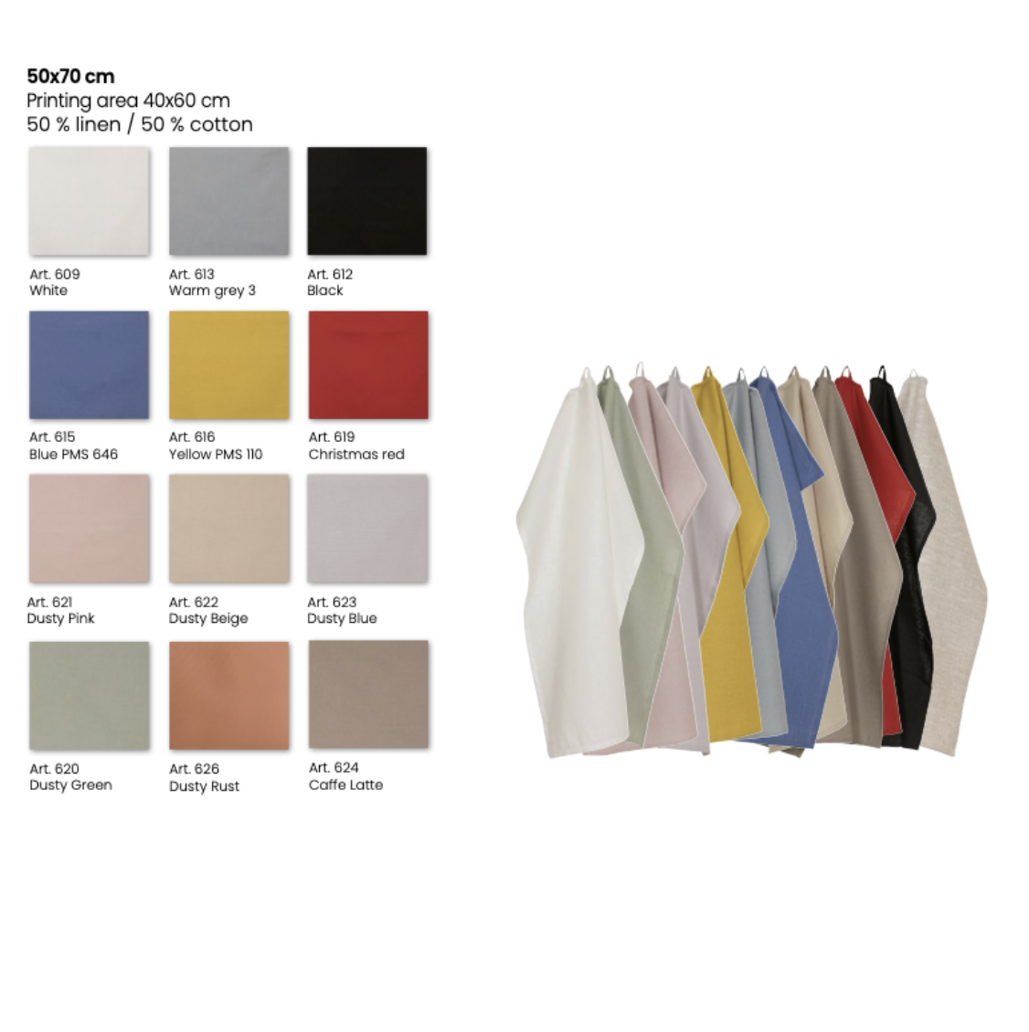 Pyyhkeen mitat 50 x 70cm, suuri painatusala 40 x 60cm.
